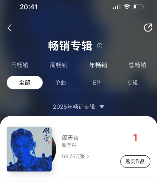 从数据上看,《闹天宫》的表现堪称惊艳。全平台总销量突破71万张,销售额超2136万元,一举刷新了内娱数字专辑总销量纪录。在QQ音乐单平台上,销量更是达到了69.6万张,总榜排名上升至第15位,成功超越了原纪录保持者《STEP》。这样的成绩,不仅证明了张艺兴在音乐市场上的强大号召力,也彰显了他作为音乐人的商业价值。