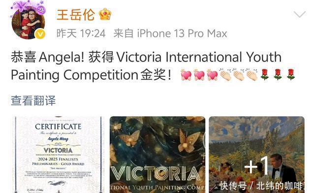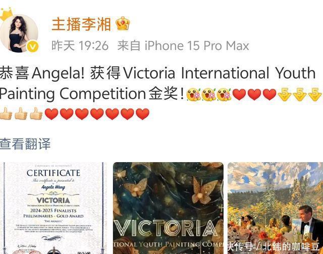 昨晚,李湘通过社交平台发文,内容是恭喜女儿王诗龄的画作在国外的比赛中获得大奖,还是金奖