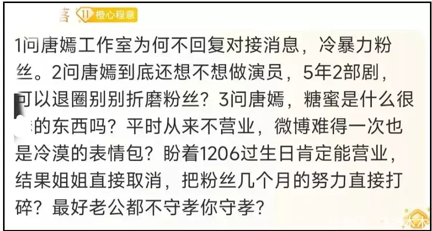 有粉丝留下一长段评论三问唐嫣和工作室,其中第二问格外刺耳,直接质问唐嫣本人到底还想不想做演员了,5年只播了2部剧,不如退圈别折磨粉丝了。