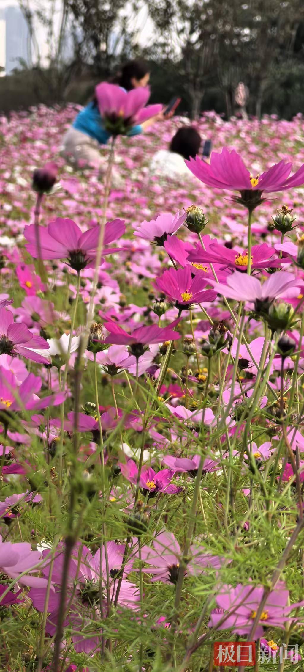 粉的、白的、紫的花错落着,有小朋友在花丛中嬉戏,有年轻的朋友戴着洋帽在花丛中拍照,也有阿姨们在花丛中跳舞,花海和人群交相辉映,美不胜收。