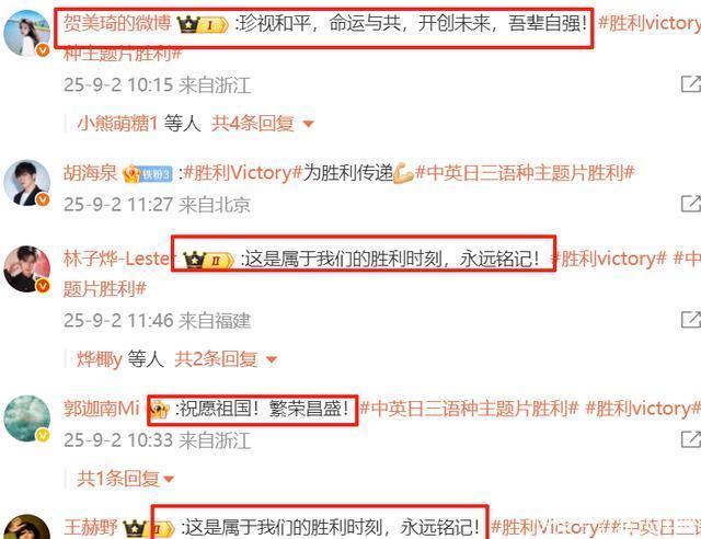 还有贺美琦、歌手胡海泉、林子烨、郭迦南,王贺野等明星艺人也纷纷转发留言,庆祝抗战是胜利80周年。