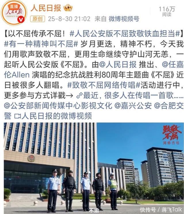演员任嘉伦演唱了人民公安版的《不屈》也是纪念抗战胜利80周年主题曲,该曲也是被官媒推广。