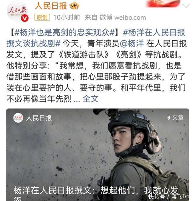 而演员杨洋就更厉害了,在官媒上发文章提及了《铁道游击队》《亮剑》等抗战剧,直言也是借那些画面和故事,把自己心里的那股劲提起来。