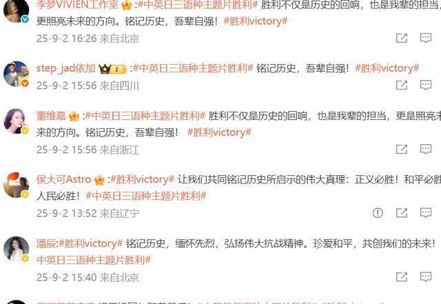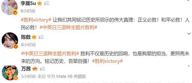 演员李晟称,让我们共同铭记历史所启示的伟大真理,正义必胜,和平必胜。而演员陈数、万茜也纷纷复制传递抗战精神。