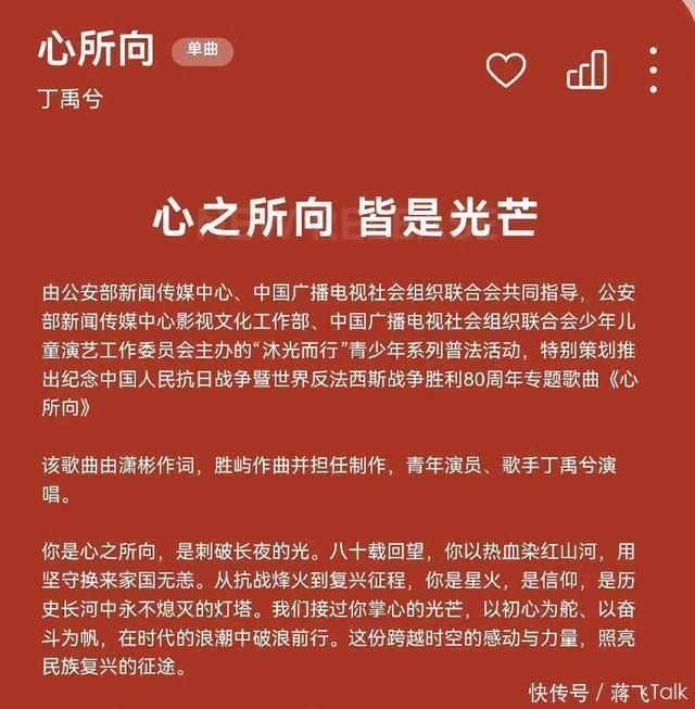 同样,艺人丁禹兮,也是演唱了由多部门共同策划推出了纪念抗战胜利80周年专题歌曲《心所向》